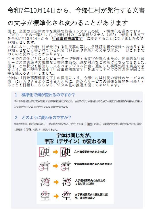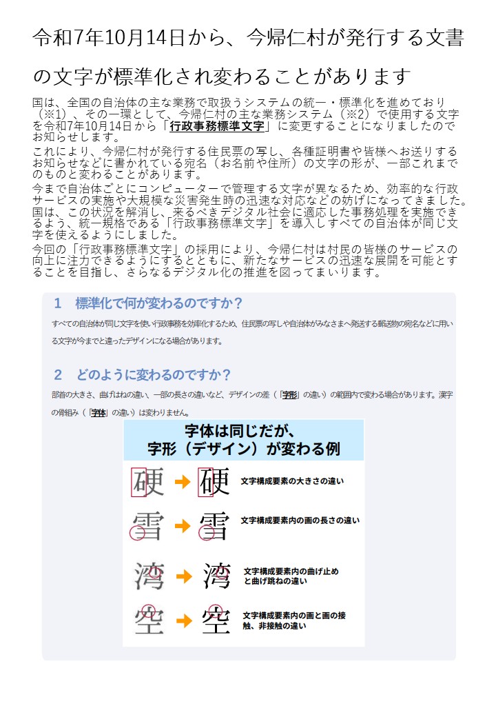 令和7年10月14日から、今帰仁村が発行する文書の文字が標準化され変わることがあります