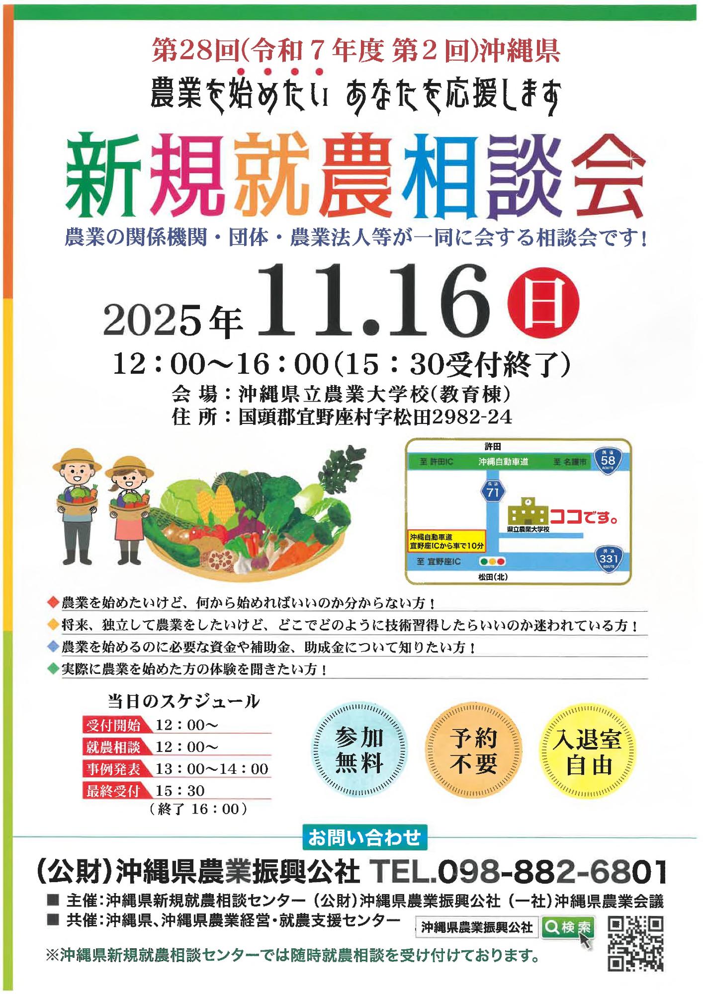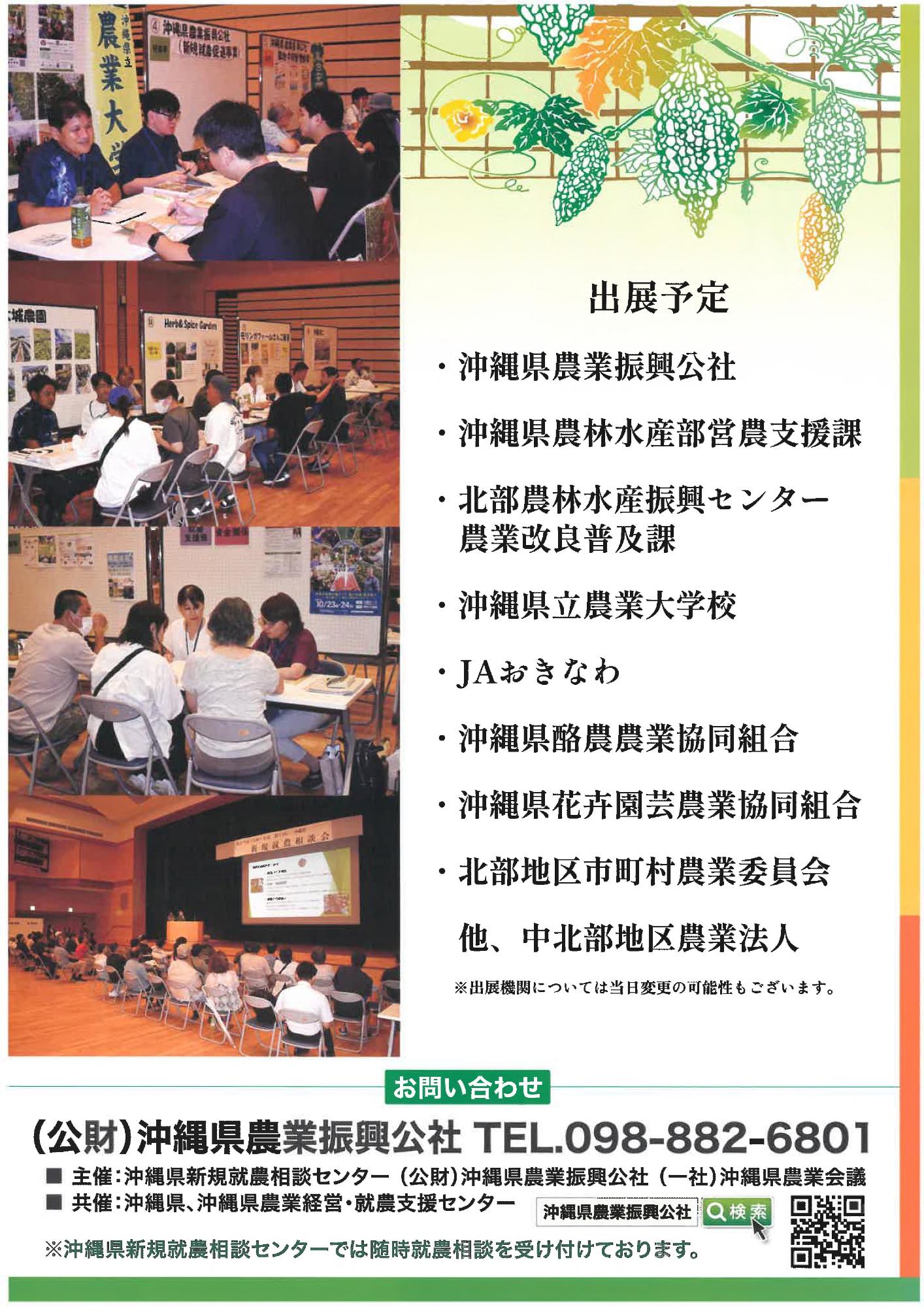みだしの件について、新たに就農を希望する方などを対象に、新規就農相談会が開催されます。今帰仁村でも相談ブースを設ける予定となっていますので、興味のある方はお気軽にご参加ください。